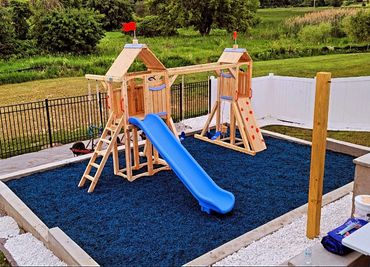 Most play-sets need a surface within a few inches of level to be built. We can accommodate most scenarios by adding more wood to the play-set. (if needed we can make a run to the closest hardware store.)